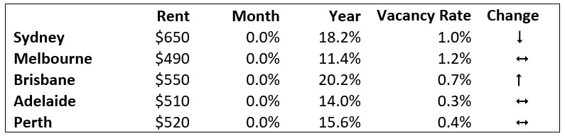 Sydney remains the most expensive capital for weekly asking house rents at $650 with Melbourne the most affordable at $490.